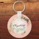 A key chain with a floral rose bouquet with white and pink flowers. Background is pink with a floral pattern. Pretty and elegant design. A white semi-transparent circle layered over top with a faux gold foil border. Personalize with a name.