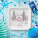These charming Christmas paper plates feature a soft watercolor illustration of a pink cottage nestled among snowy evergreens and bare winter trees. The elegant "Merry Christmas" greeting is printed in a delicate serif font, adding a cozy and festive touch. Perfect for holiday dinners, parties, and seasonal gatherings, these plates bring charm and style to your festive table settings.