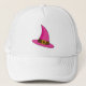 An illustration of a cute cartoon pink witch hat for halloween and witch craft enthusiast. This design is a gift idea for girly aesthetic lovers and fuchsia or magenta colour lovers.