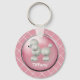 Cute poodle key chain done in a pink, with a white criss cross pattern. Graphics of a large pink button, in the middle, has an adorable fluffy white poodle, and white custom text. Personalize the text to read what ever you want. Makes a great gift idea.