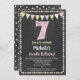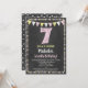 Une invitation funky à 7ème anniversaire rose et jaune tableau noir avec du texte de craie collant en haut avec un arrière - plan de tableau noir, des drapeaux et une jolie bordure à pois polka.