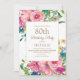 Elegant and colourful pink, blue, and yellow watercolor floral with gold glitter on a white 80th birthday party invitation for women. Contact the designer for help with customization or to request matching or coordinating products. The text on this card is completely customizable and can be designed for a party celebrating anyone of any age.