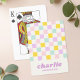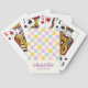 Playing cards featuring a light pink, yellow, purple and aqua blue chequerboard pattern and your name in a retro style, purple font with a line of custom text below. All colours are customizable.