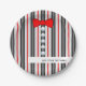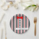 This fun design, is suitable for many occasions. For a casual event, these red, white and black stripes over a dark grey background have the right amount of pizzaz. Completing the look, there's a bright red bow tied five silver metallic buttons. The text area, at the bottom, can be personalized with a name, occasion or special event. You can also remove the text block.
