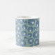 This mug has a mid-century modern design of dusty blue circles with white starbursts inside on a field of seafoam green.