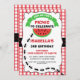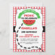 Cette invitation de fête d'anniversaire de pique-nique pour filles comprend une tranche de pastèque, une bannière verte à ruban, des fourmis, un cadre décoratif blanc et un motif en plaid rouge et blanc. Le design comprend également une ceinture noire. Je voulais créer une invitation à pique-niquer pour le magasin parce que je n'en ai pas actuellement. La même conception d'invitation avec la photo est disponible au magasin ainsi que des autocollants d'anniversaire. Cette invitation de fête d'anniversaire de pique-nique ou de pastèque est prête à être personnalisée.
