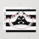 Une invitation par carte postale d'anniversaire avec l'illustration d'un casquette pirate et du bunting. L'Arrière - plan est des rayures noires. Personnalisez tout le texte.