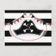A birthday postcard invitation featuring an illustration of a pirate hat and bunting. Background is black stripes. Personalize all text.