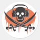 Pirate DJ design features skull with headphones and crossed swords over dripping orange paint. Dedicated to the pirate DJs who keep the music alive.