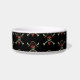 This pet bowl is shown in white with a black accent strip with a cute pirate print design.
