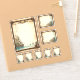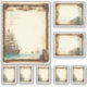 Fun sticker set with sail ships in one corner, coffee stained vintage background and a brown border frame with small details. Ocean with smaller sail ships in the horizont.