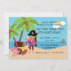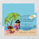 This cute pirate girl birthday party invitation features a girl dressed as a pirate with a hook hand and a peg leg on the beach under a palm tree with her treasure chest full of gold. Her pirate ship can be seen anchored offshore in the ocean.