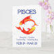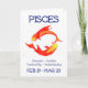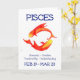 A birthday card for a Piscean with two brilliant orange fish, from a watercolour painting by Judy Adamson. 'PISCES', the dates and some of the positive traits of Pisceans are written in dark blue text.