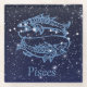 Glass coaster featuring the zodiac symbol for Pisces in soft silver blue, overlaid with the stars of the constellation, against a starry sky background graded from deep midnight blue to black.