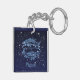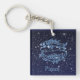Keychain featuring the zodiac symbol for Pisces in soft silver blue, overlaid with the stars of the constellation, against a starry sky background graded from deep midnight blue to black.