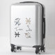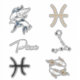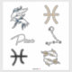 Pisces twin fish astrology symbols in a custom cut vinyl sticker page with six different images. Delicate line ink drawings, symbols in black and gold, a black constellation of stars, and Pisces text in a fabulous black handwritten font.