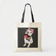 Natural canvas tote printed with a smiling white pitbull puppy on a dark grey background.