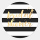 PixDezines bridal shower, dazzled faux gold cool and chic script with ink splatters on black and white stripes DIY background colour.