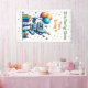 Personalized Birthday banner with a robot theme. Cute pixel art robot, to give it a gaming vibe, in orange and teal blue, holding balloons and gifts. Cute for any little boy.