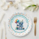 Pixel art robot themed birthday Paper Plates. Ai art depicting a robot holding balloons surrounded by birthday gifts and blue and orange pixel dots.