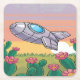 This coaster features a charming pixel art image of a metallic silver spaceship landing in a field. The spaceship has a rounded design with visible panel lines and a single, glowing blue porthole. The landing area is filled with whimsical cacti adorned with bright pink and yellow flowers, creating a cute and inviting scene. A soft gradient sunset of pastel oranges and purples fills the sky in the background, establishing a tranquil and pleasant atmosphere. The coaster is a square paper pulp coaster. The coaster set contains six coasters.