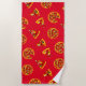 Pizza Lover Fun Food Pattern Beach Towel. Red beach towel patterned with fully loaded tasty pizzas.