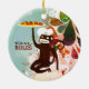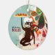 Funny and cute pizza monkey chef holding a pie, with abstract artsy fartsy background on this culinary Christmas ornament for chefs, restaurant or catering office trees or for gifting your favourite junk food foodie.