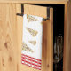 This custom kitchen dish towel or tea towel has slices of pizza all over it, on a white background. The border looks like a red chequered tablecloth. It reminds me of a pizzeria.
