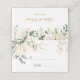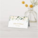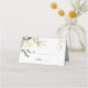 Elégante carte de place avec une illustration de roses blanches, feuillage verdoyant et fleurs dorées en aquarelle.