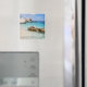 Aimant photo souvenir avec de gros rochers dans l'eau et dans le sable de la plage de Cala Mariolu dans le golfe d'Orosei à la côte d'émeraude de l'île Sardaigne dans la mer Méditerranée, Italie avec le texte : "Sardaigne, Golfo di Orosei".