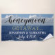 Lune de miel Getaway thème de la plage. Personnalisez avec les prénoms des jeunes mariés en texte blanc et la date du mariage. La lune de miel est écrite en écriture noire. Getaway est écrit dans une police jaune cool. L'Arrière - plan a un bel océan bleu avec des vagues de mousse blanche et le ciel bleu clair avec de gros nuages blancs moelleux. Serviettes de plage pour le nouveau Monsieur et Madame Design Photographique original © TamiraZDesigns.