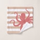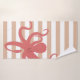 Cette serviette de bain moderne et branchée de style plage contient une pieuvre rouge contre un arrière - plan rayé blanc et sable. Vous pouvez personnaliser cette serviette de bain avec votre initiale.