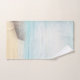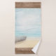 Serviette à motifs sertie d'une belle image rustique. Couleurs subtiles de bleu clair, marron sablonneux et blanc doux. Une scène de plage avec un bateau sur le rivage avec un filet de pêche accroché à côté. Un élégant look défraîchi.