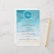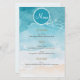 Plage, Océan Aquarelle Arrière - plan menu Mariage Ce magnifique menu mariage saisissant capture la beauté sereine d'un thème côtier avec son aquarelle arrière - plan dans les tons bleu et beige doux, rappelant l'océan et les plages de sable. Le design se compose d'un cadre circulaire aux bords blancs délicats, donnant l'effet de vagues qui lèvent doucement le rivage. Les noms du couple sont élégamment écrits dans une police de script fluide, ajoutant une touche romantique, tandis que les détails sont affichés dans une police serif propre dans un ton chaud et or. Parfait pour un mariage sur la plage ou à destination, cette invitation exhale calme et élégance, invitant les invités à se joindre à une célébration remplie d'amour et de beauté naturelle. F008