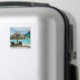Aimant frigo souvenir d'un parasol en chaume et de deux chaises longues sur une plage de sable blanc dans une luxueuse station balnéaire en bungalow sur l'eau dans le lagon bleu clair de l'île pacifique de Bora Bora, près de Tahiti en Polynésie française.