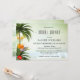 Invitation à la douche nuptiale avec une scène de plage tropicale avec palmiers, lanternes festives et fleurs colorées, donnant sur un océan pétillant vert.