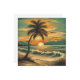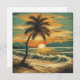 Voici une image représentant une scène extérieure idyllique vintage. La couleur dominante du premier plan est le jaune, et la couleur dominante de l'arrière - plan est le marron, ce qui contribue à une palette de couleurs chaudes. L'image représente un cadre de plage avec un palmier comme point central. Le ciel au-dessus de la plage est rempli de nuages, créant un paysage serein. L'image comprend également un coucher de soleil, donnant un sens du temps.