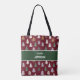 Custom all over print tote bag personalized with your monogram name and surname. This cute Christmas tree's design consists of a plaid and stripe patterned Christmas tree's pattern on a maroon background with a dark green stripe crossing it. Simply edit the design by clicking on "personalize this template" and change the text. The text will change on both sides at the same time.