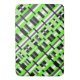 This bath mat features a modern twist on plaid in shades of lime green, grey, black and white.