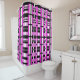 This shower curtain features a modern twist on plaid in shades of pink, grey, black and white.