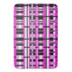 This bath mat features a modern twist on plaid in shades of pink, grey, black and white.
