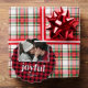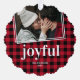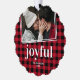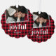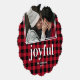 Classic christmas holiday ornament card featuring a family photo with a white contemporary 2 border design, a red & black plaid backdrop, the beautiful word "joyful" in a elegant font, your names, and year.