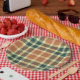 Lovely plaid paper plates with fall colours. The colours used to make the plaid design are Orange, Green, and yellow.