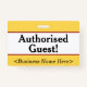 This plain badge design features the message "Authorised Guest!", and a customizable company name or other custom message. A badge like this could be used to indicate that a visitor or guest at a workplace is allowed to be there. [~Z0000307]