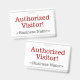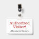 This plain badge design features the message "Authorized Visitor!", and a customizable company name or other custom message. It also features a double-line border. A badge like this could maybe be used to show that somebody at a business or workplace is an authorized guest or visitor. [~Z0000307]