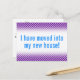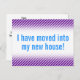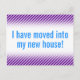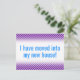 This minimalist new-address postcard design features the message "I have moved into my new house!" on the front, and a customizable message on the back. Postcards like this might be used to share the sender’s new contact info with friends and family.