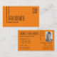 Make a lasting impression with this classic and simple business card design wit black font & fine decor stripes, monogram and (employees-) photo on a plain orange background.