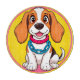 Illustration d'un joyeux chien de dessin animé aux yeux expressifs, portant un collier décoratif, assis contre un arrière - plan en cercle coloré. Idéal pour les dessins animés, l’art pour enfants ou les graphismes ludiques.