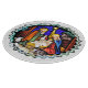 Un vitrail design photographique de la crèche avec Marie, Joseph et le bébé Jésus.
