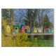 Cette planche à découper en verre présente une rangée d'oiseaux colorés qui dorment au soleil de printemps. Un buisson forsythia jaune, des arbres, le ciel bleu et l'herbe verte encadrent la rangée de maisons d'oiseaux uniques. Montrez votre amour pour les amis à plumes et leurs oiseaux.